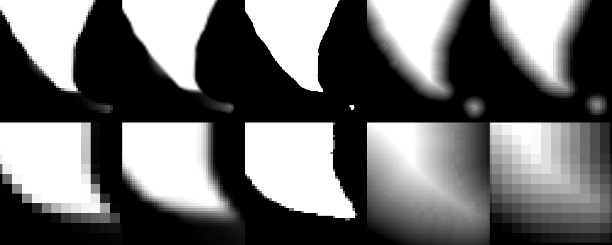 Therefore we compute a signed distance field of water and one that maps terrain height, blur the height map over a large area and then compute the local difference to an areas neighbors. This leaves us with the water map and the map shown above for local terrain elevation changes.