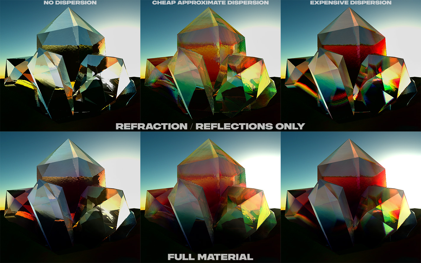 Dispersion is the property which describes the way a prism splits white light into all the colors of the rainbow. To add dispersion into the picture, we may simply sum up our material samples from above with only our IOR varying slightly, by taking a value