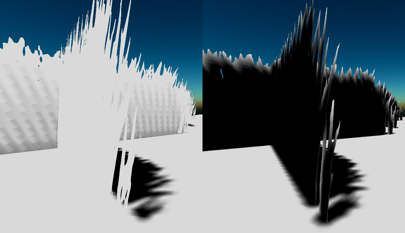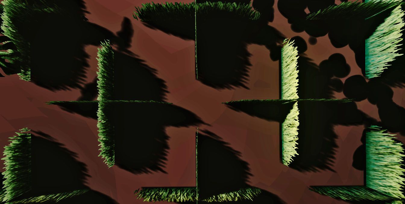 To supplement the grass and enable moss growth on rocks and other similar surfaces, we create a vegetation-height map that is a half-terrain-resolution approximation of the height of grass - or only moss, if the values are too low to allow grass to grow. We can now color the grass depending on the length to achieve some more visual interest.