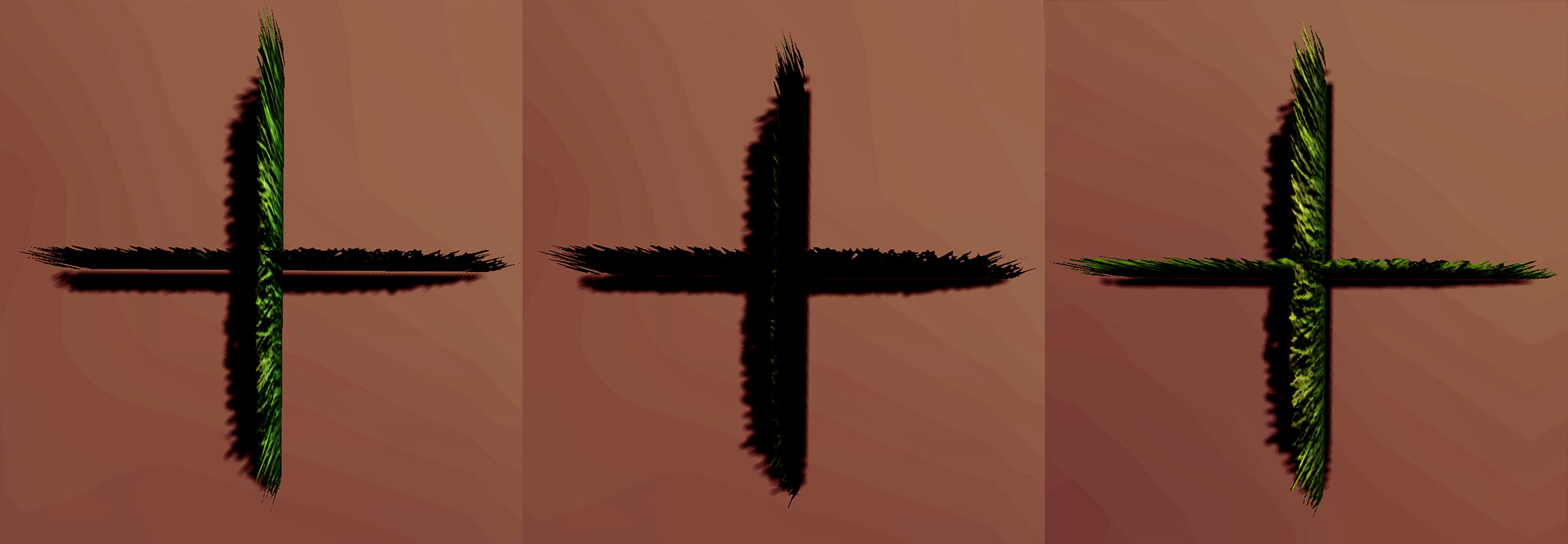 Giving the height channel some bumps here and there and sampling a different color depending on the moss height leaves us with a nice fluffy mossy texture that nicely complements the grass.